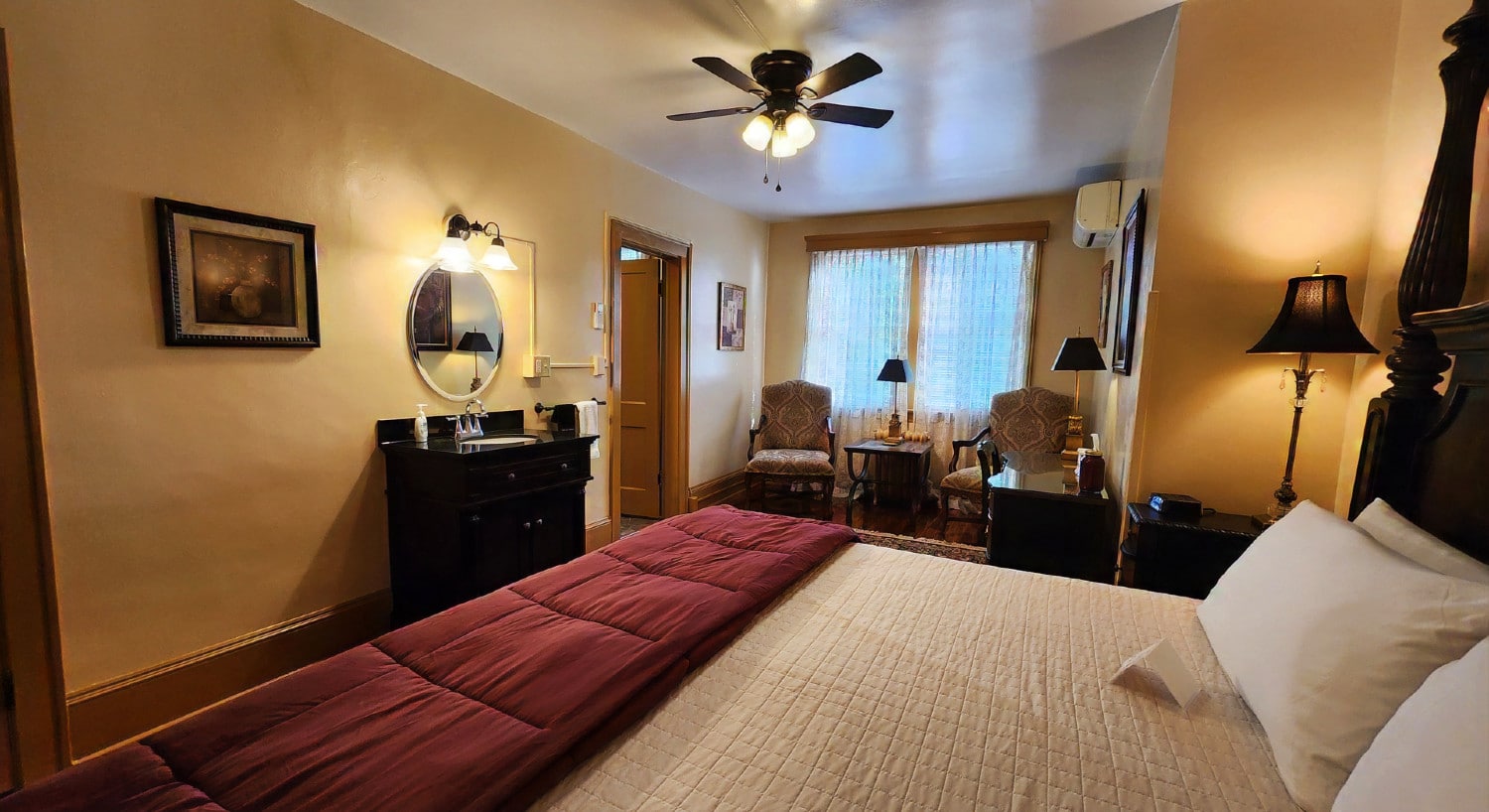 The Beaujolais room is the largest standard guest room in the inn and is located in the middle of the house on the 3rd floor. Relax in this elegant guest room decorated with soft gold walls, cherry furniture and a king size bed with memory foam mattress. The original hardwood floor is accented by a couple of red and gold area rugs. A sitting area with two arm chairs is perfect for curling up with one of our library books.